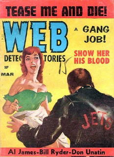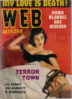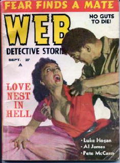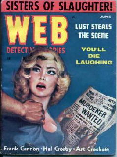 – from “Just Kill Him, Darling” by Jay Richards (WDS, Vol. 2 No. 3, April 1959) So I’ve told you the how, but now you want to know the why. Why should the discerning crime digest collector spend maybe twenty to thirty bucks an issue for WDS? If you are the typical crazed collector, chances are WDS is on your want list anyway. So, fine, you’ve got them on the list. Should you just put them in a sleeve and adore their garish covers or are they worth reading? I think so, but not many others side with me on my opinion since I’ve yet to see a WDS story anthologized, even though there are at least two dozen (out of 148 stories) that are worthy of a second look. Lawrence Block, Harlan Ellison, Edward D. Hoch, Ed Lacy, H. A. DeRosso, Frank Kane, Robert Silverberg, Henry Slesar, Fletcher Flora. Does this sound like the lineup of a worthless venture? You don’t care about the insides? You want GGA? You got it. WDS delivers in spades with lurid, pulpish, colorful covers reminiscent of such pulp titles as Dime Mystery and Horror Stories. Big-breasted women threatened with knives or heaters. The titles of many of the stories also evoked memories of the pulp days: “Scream the Night Through,” “Short Cut to Hell,” “Murder Wins the Jackpot,” “Dumb Blondes are Murder.” After fourteen issues, the publisher once again decided that a genre change was in order, so Web Detective Stories became Web Terror Stories and featured horror stories with an s/m and bondage slant. A 1960s version of the Spicy line of pulps. In all, there were fourteen issues of (Saturn) Web Detective Stories. Every one of them has something to recommend it. Here are some highlights, with at least one per issue: ![]() Vol. 1 No. 6 (August 1958- September on cover) “Rumble Bait” by Jimmy L. Carroll Cal Johnson’s life has never been the same since he turned squealer on his partner. Now he’s opened himself up for beatings on the street from everyone, including our man of the moment, Slim. Our story opens with Slim doing the squealer stomp on poor Cal on his way to meet up with parter-in-crime, Fats. The two are caught by a shotgun-wielding farmer while stealing watermelons. Fats gets away but Slim goes right to jail without passing GO. To avoid severe beatings from the sheriff and his sadistic deputy, Slim gives up Fats on the condition that no one on the street is to find out exactly who gave up Fats. But the sheriff isn’t known for his honesty, and Slim becomes “open game” on the streets just like his old friend Cal. Reminded me a lot of EC Shock Suspenstories comics, which populated itself with corrupt lawmen and ironic comeuppances. Vol. 2 No. 1 (October 1958) “A Touch of Evil” by Jim Allen Card shark Johnny Morgan rolls into town and joins in a game with the respectable, and quite wealthy, Lou Shero. Morgan takes Shero for every penny he’s worth, which doesn’t sit well with the big man. Morgan is set up as fall guy for a rape charge by one of Shero’s working girls and is hauled away by the cops. A jawdropper is that the working girl is actually Shero’s daughter! Vol. 2 No. 2 (February 1959) “Sure Bet on Death!” by Buck Grimes Boxing manager Sandy Michaels spots the surest thing he’s ever laid eyes on: Mugsy Thomas. With no money, Michaels has to go to loan shark Whitie Malone for the bucks to train Mugsy. In the meantime, Mugsy falls for Greta, a (big surprise here) busty, curvy knockout. The bimbo lures the fighter away from Sandy with promises of lust-filled nights and diamond-studded dog collars. All the walls seem to be coming down on Sandy Michaels at the same time and the nice guy is definitely finishing last. A really good sports/mob thriller that’s about as close to a short Gold Medal novel as you’re likely to find in the pages of WDS. Vol. 2 No. 3 (April 1959) “Mark Him for Me!” by Jim Barnett A violent gang with the moniker of The Pythons moves into town and immediately starts to shake everything up and everyone down. A rival gang, newly crowned The Mongooses, decides to do something about it. Good juvenile delinquent tale with a nice surprise climax. This issue also features an early story by Lawrence Block. Vol. 2 No. 3 (June 1959) “Hate Goes Courting” by Lawrence Block Very short and very stark, “Hate Goes Courting!” tells the story of two brothers, John and Brad, and John’s fiance Margie, a girl with a questionable past. Brad knows about that past and continually taunts his brother until the man finally bursts out in rage: When you’re up close a shotgun makes a big