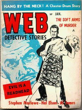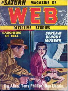 – from “As Hot as Ginger” by Art Crockett (Web Detective, Vol. 3 No. 3, Oct 1960) To find class in 1950s crime digests, look no further than Manhunt. To find something a little more unorthodox, a little sleazier, a little goofier, hunt down Web Detective Stories. It won’t be easy, but the spoils are worth the hassle. Of all the crime digests I’ve collected, the one title that gave me the most trouble was WDS. It’s not just that WDS suffered from lousy distribution and rack placement (as did most of the lesser crime digests of the early 1960s), but it also has the distinction of being one of the most confusing digests of all time. WDS was born Saturn, The Magazine of Science Fiction (Candar Publishing) in March 1957. The editor was the respected Donald A. Wollheim, editor of Ace Books (later to found DAW Books), and the contents varied from non-fiction to reprints to fiction by such genre mainstays as Harlan Ellison and Robert Silverberg. Not able to distinguish itself from the dozens of other SF digests of the Day, Saturn soon found itself facing extinction. For some unknown reason, the publisher chose to simply change its title to Saturn Web Detective Stories after only five issues, rather than kill Saturn SF and start up a crime digest. (I’m assuming that the publisher, in his infinite wisdom, decided that the crime waters weren’t as crowded as the SF sea.) The Saturn was dropped after four issues and the title became simply Web Detective. This title-changing contributes to some of the mass confusion surrounding WDS. If it weren’t for crime scholars and historians like Bill Pronzini and Mike Ashley, today’s collectors would still be searching the back rooms of old bookstores (not too likely) or the cyberspace of eBay (very likely) for information regarding those mysterious first five issues of WDS. Add to the confusion the fact that there are actually two issues labeled Volume Two, Number Three, and that some of the issues are dated differently on their covers and contents page (presenting dealers with the dilemma:which date do I list in my catalogue?), and you can understand why this run is such a collecting nightmare. I told her who I was and what I