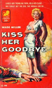 of noir-meister Jim Thompson and Mississippi novelist Ben Ames Williams.Kiss Her Goodbye appeared in 1956, three years before the authors’ most colorfully titled novel, Kitten with a Whip. This novel became a movie in 1964, a drive-in theater fare starring Ann-Margret and John Forsythe. Wade Miller later wrote the screenplay for KISS HER GOODBYE, a homonymous movie slated to star Charlton Heston, Robert Taylor (the antagonist), and Barbara Lang, a Marilyn Monroe lookalike starlet. When that deal fell through, it was made into a largely forgettable film in 1959 starring Andrew Prine, Steven Hill (the DA in the original Law and Order TV series), and Sharon Farrell. The movie, however, treats the female lead as only a precocious, adult-looking girl. The novel, however, concerns a young, beautiful, but also mentally challenged young lady named Emily Darnell. This premise leaves open many possibilities for cheap exploitation: men having their way with a full-figured desirable woman having the mind of a twelve-year-old. The lusty blurb topping the front cover almost suggests this: “Caress her trembling form, hold her close – and forget not the evil this woman can do.” The lurid cover art illustrates a curvaceous blonde with the reddest pouty lips, her flimsy white sundress ripped from one shoulder down to the upper hemisphere of her breasts. Intrigued, I recently plunked down the three dollars for a paperback that in 1956 cost 35 cents. Thankfully, the book is a far, far cry from how the still bright crimson wrapper portrays it. The opening sentences, terse and spare and vivid, are the narrative hook: Where the earth is unmasked it is called